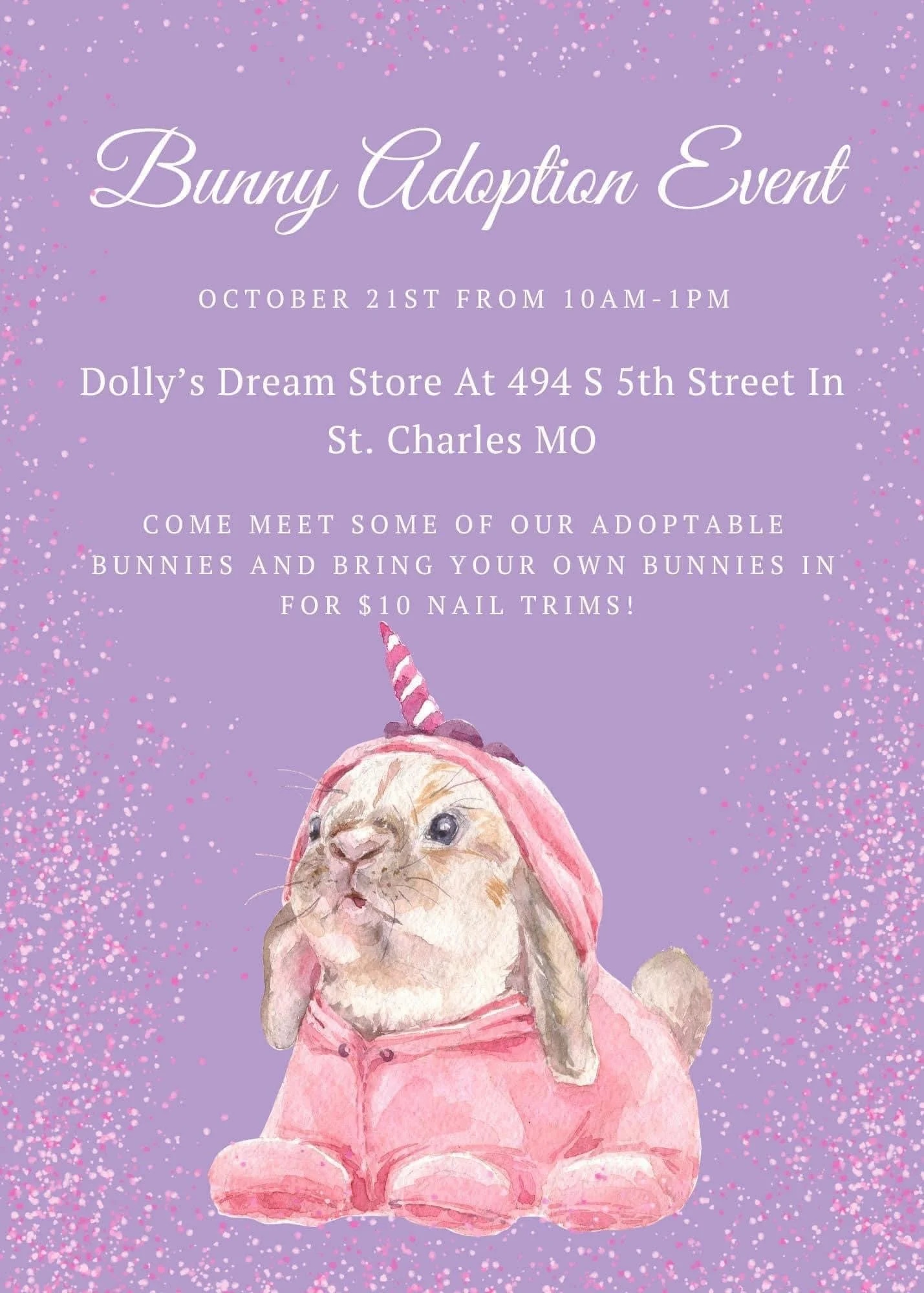 We’ll be hosting a bunny adoption event on 10/21 from 10am to 1pm. Come see what Dolly’s is all about and meet our adoptable bunnies.
