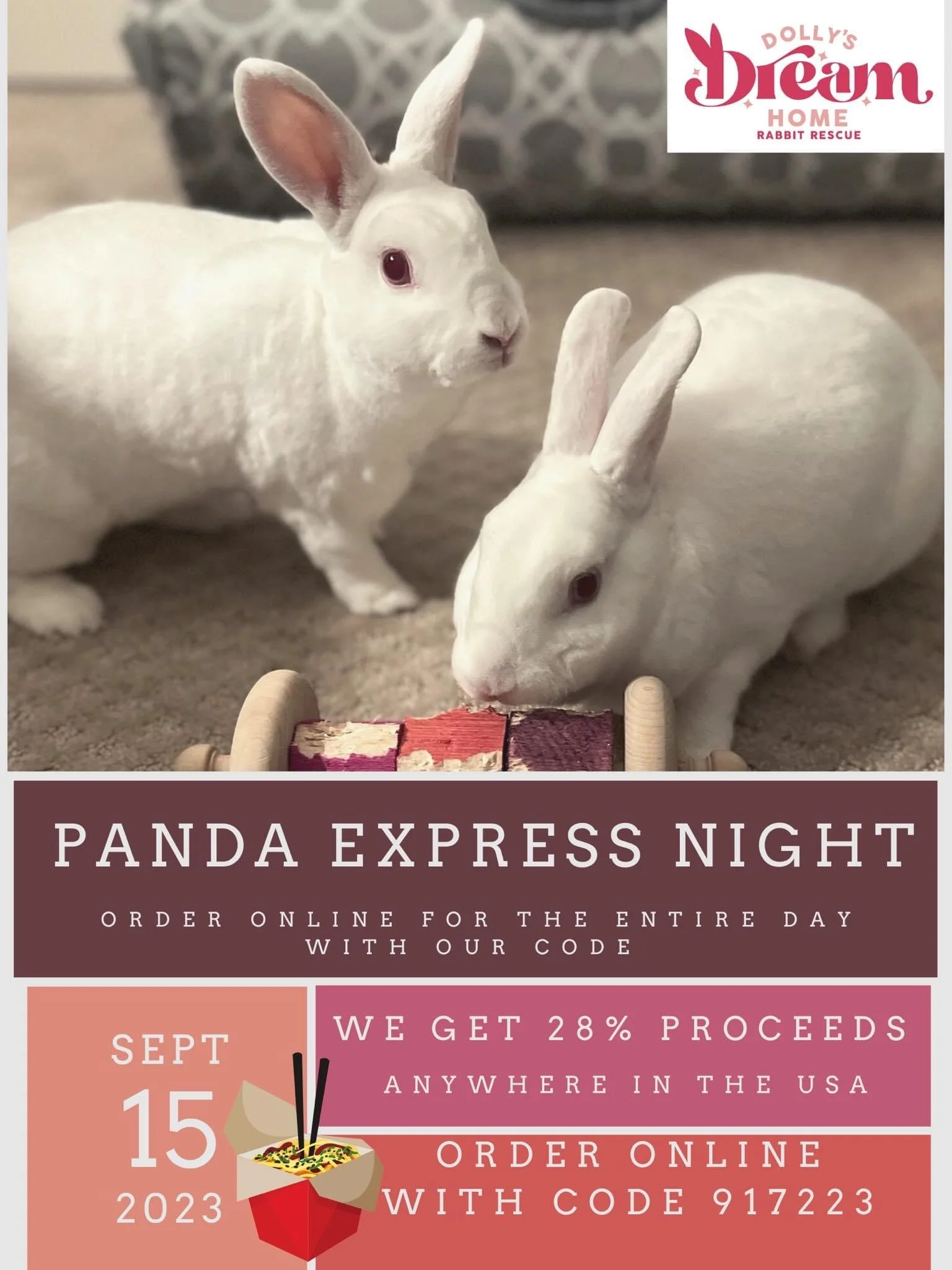 Panda Express Fundraiser Friday, September 15, 2023 5:00 AM 11:30 PM Panda Express (map) Google Calendar ICS Order Panda Express online September 15th and enter the code 917223. Dolly’s will get 28% of your order. The perfect excuse to not have to cook dinner. Anyone, anywhere in the country, can participate! Click HERE!